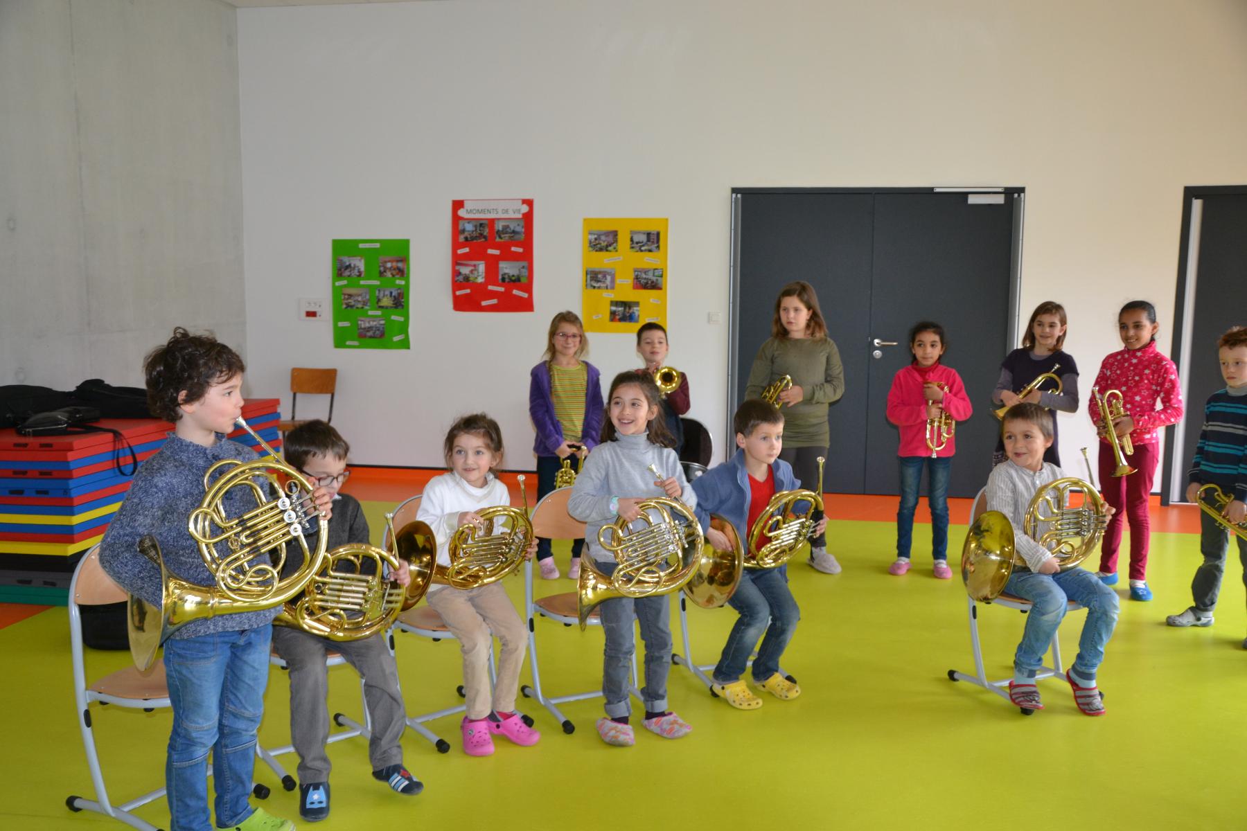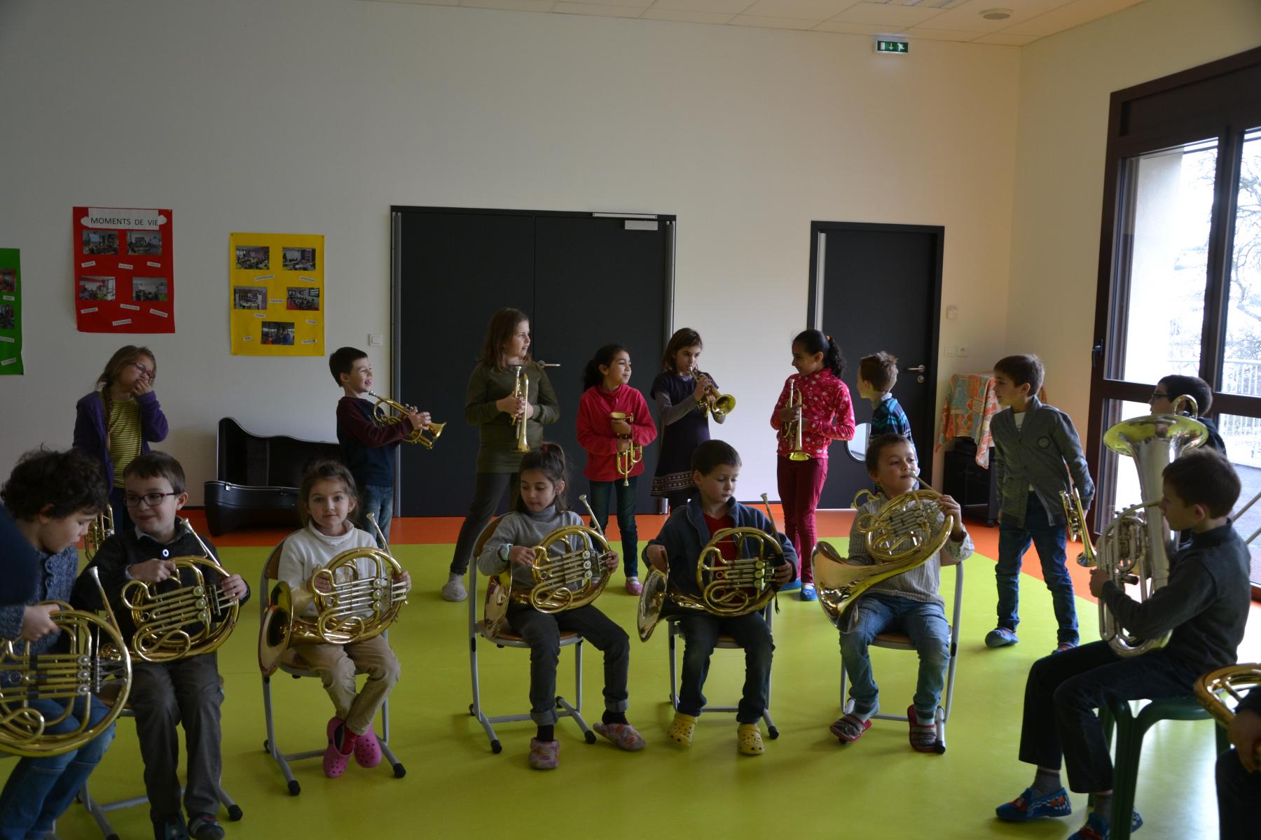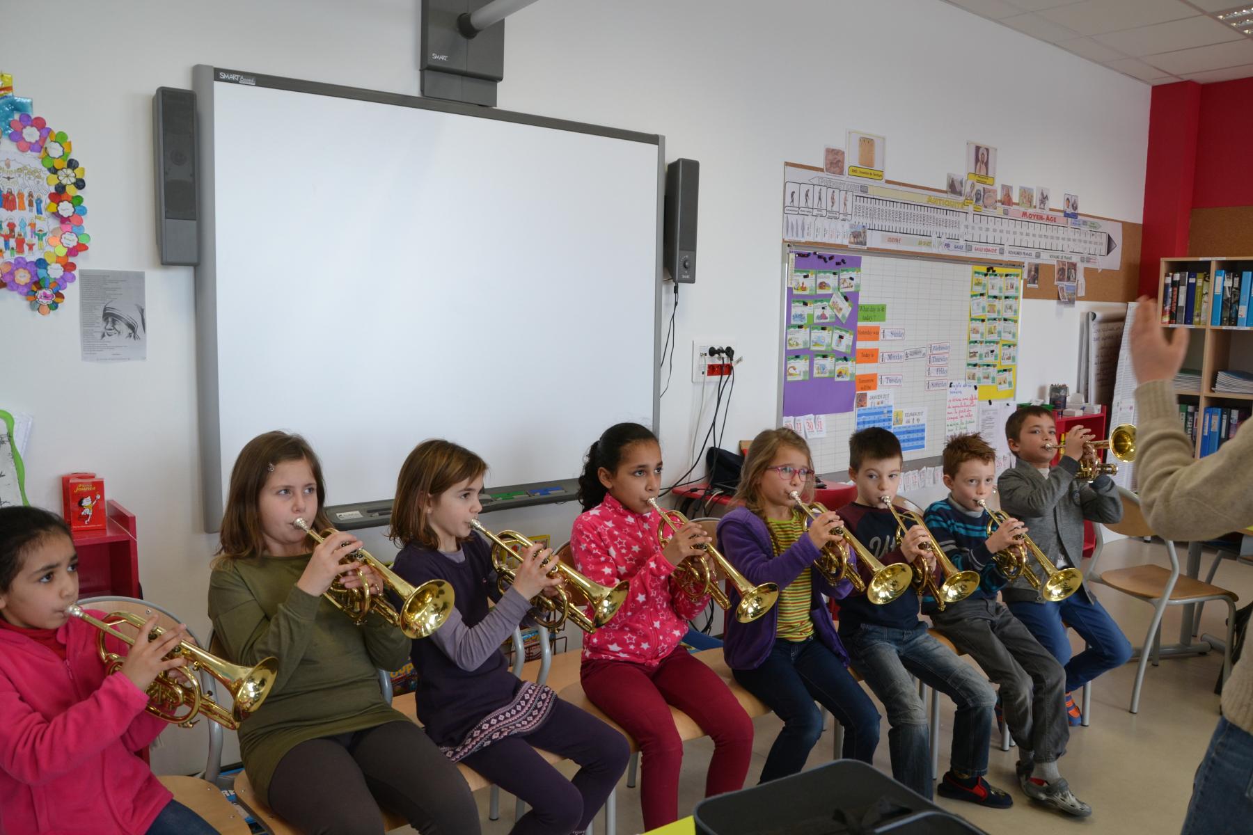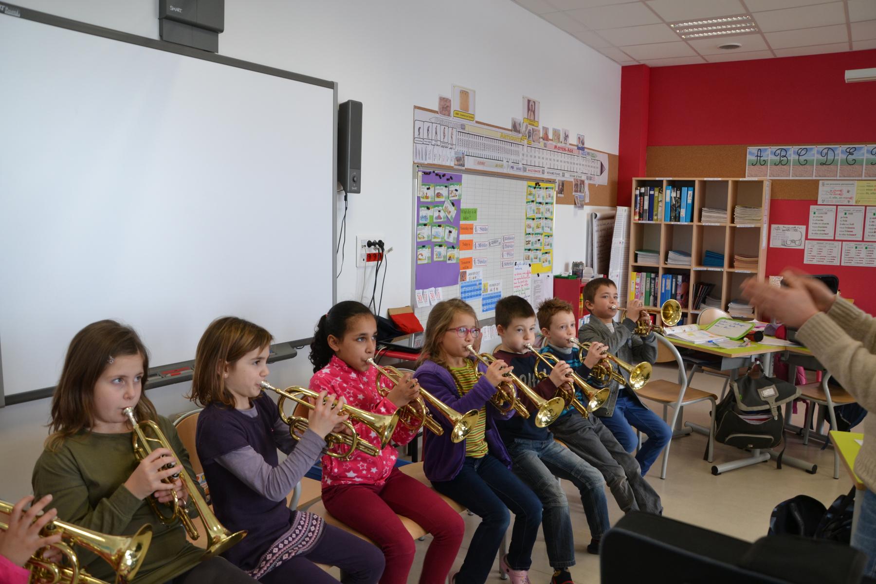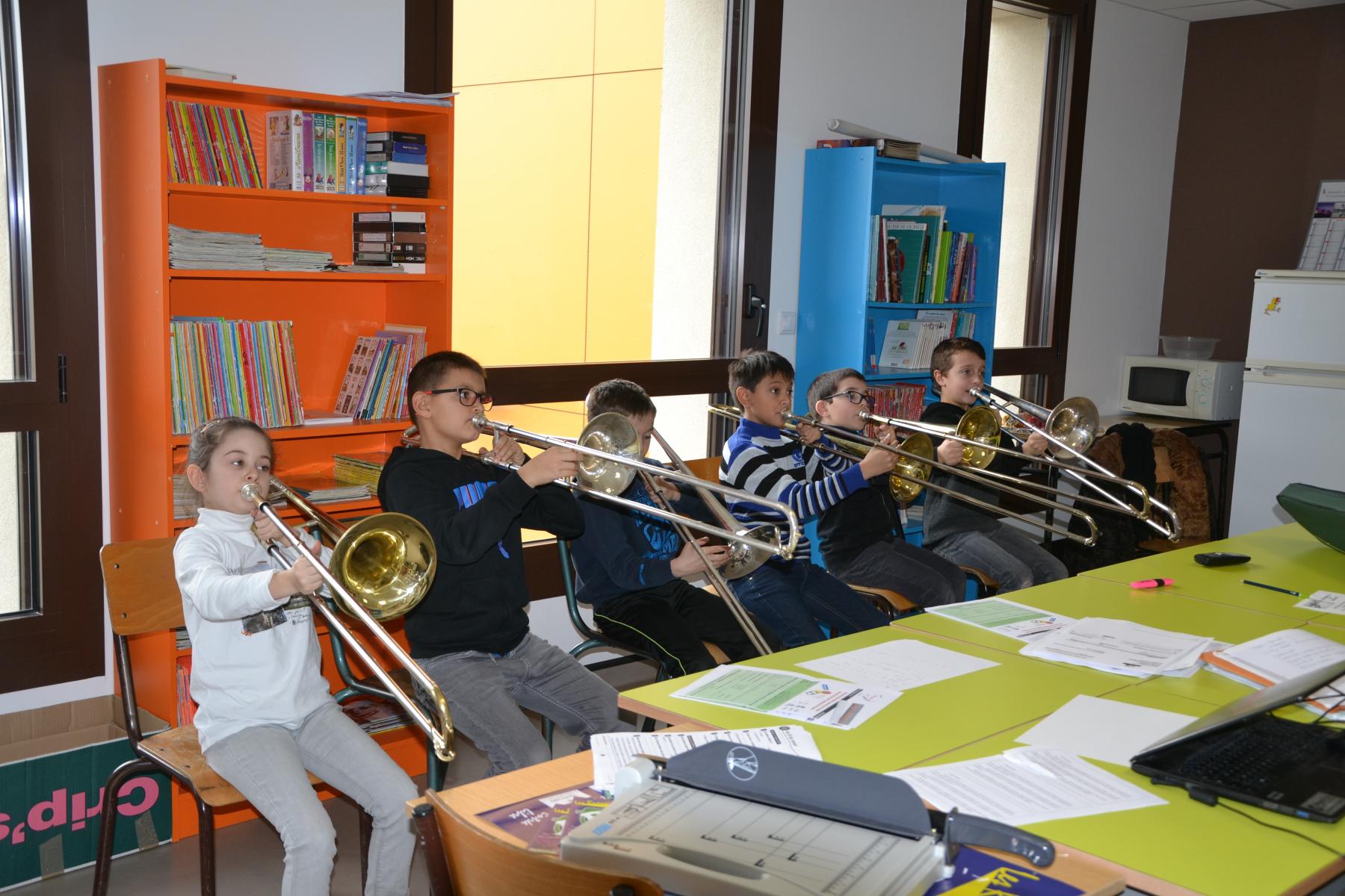 En partenariat avec l’atelier des Arts, dans le cadre du projet « classes orchestre », dès le mois de septembre, les élèves de CE1 –CE2 ont commencé à jouer des cuivres. Chaque enfant a choisi l’instrument qu’il préférait (trompette, cor, trombone ou tuba). Un spectacle aura lieu fin mai dans le cadre du festival des Impolissons. A compter d’une heure de cours par semaine, les élèves ont découvert leurs instruments, se sont familiarisés avec les notes . Ils ont appris différents morceaux. Et c’est avec fierté et un soupçon de trac qu’ils convieront parents, famille et amis à l’auditorium pour leur offrir un inoubliable concert. Pour l’instant, place à l’entraînement et aux répétitions. Tous les lundis, les élèves sont contents de retrouver leurs professeurs et ne cachent pas leur joie à l’idée d’apprendre de nouvelles mélodies.