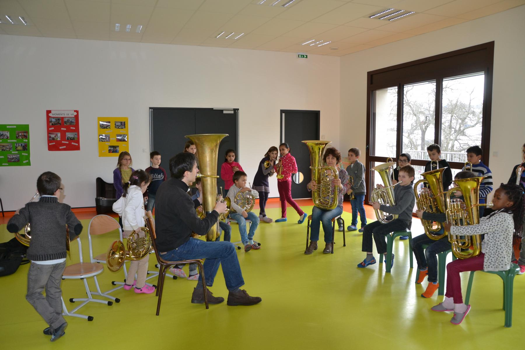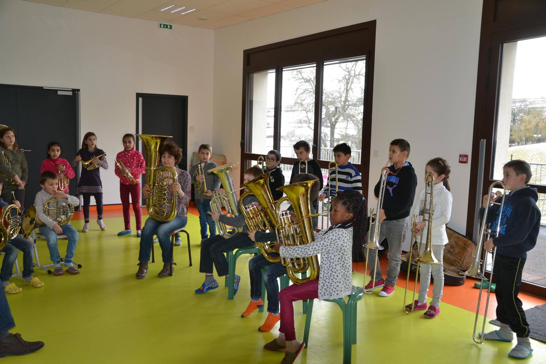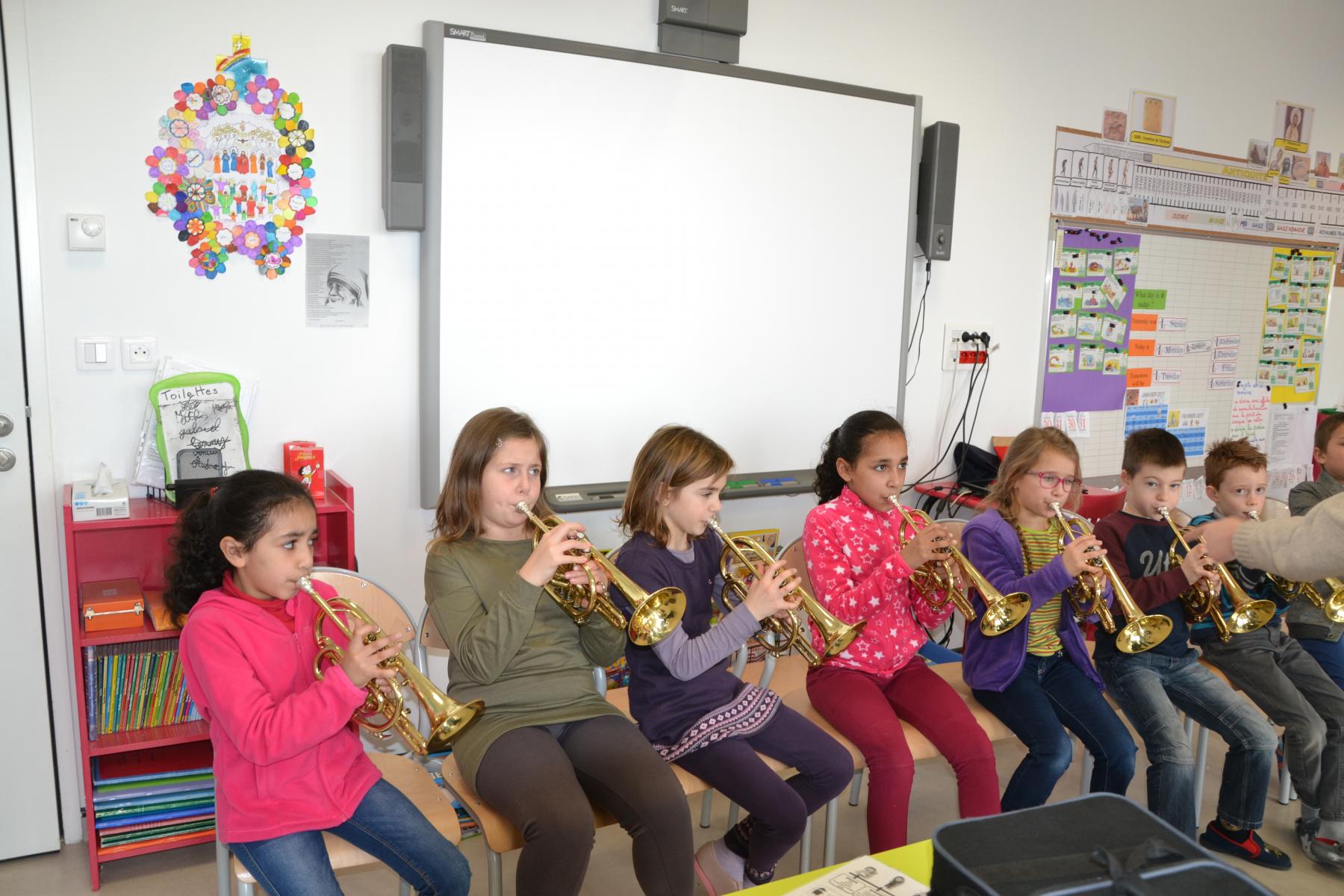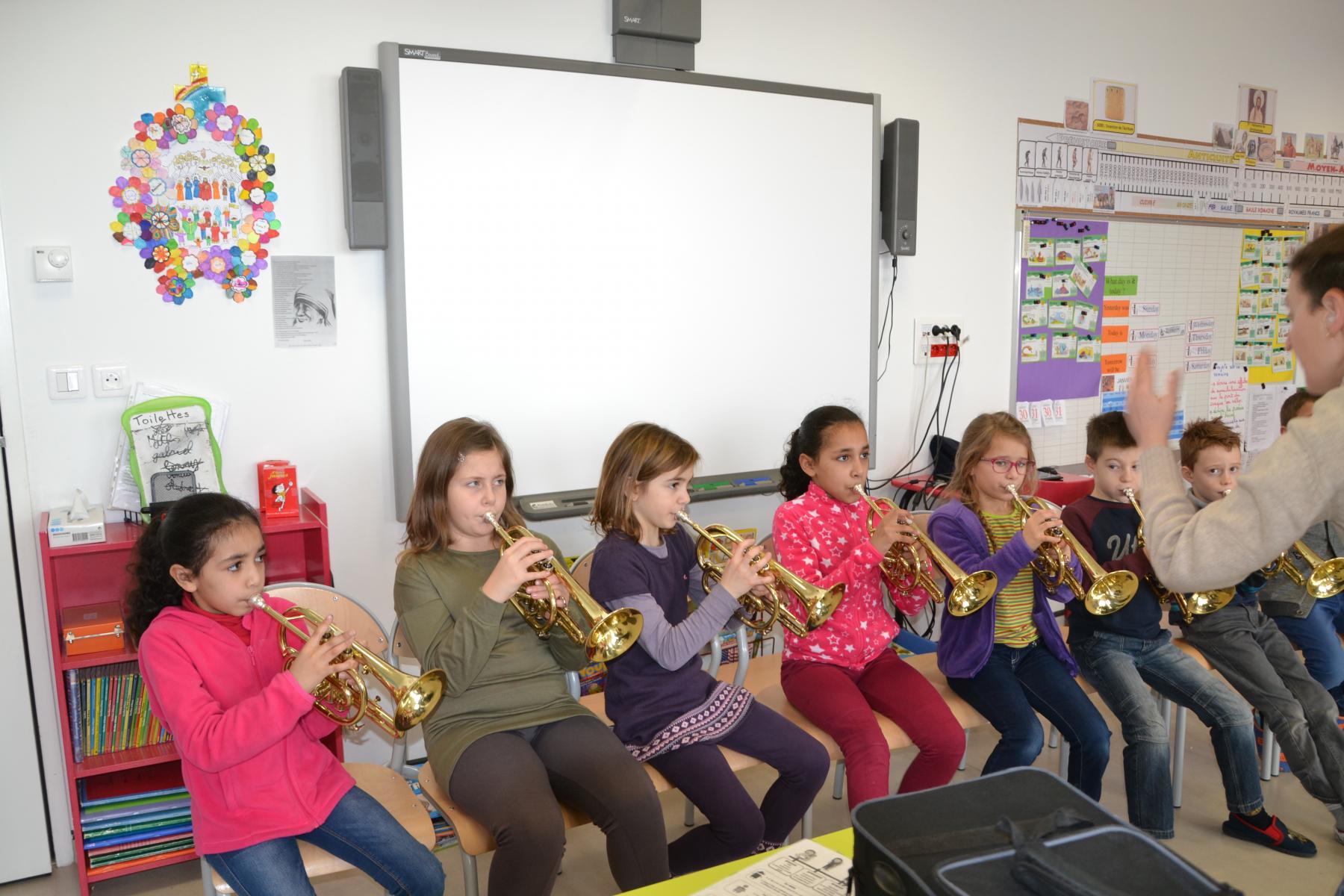 En partenariat avec l’atelier des Arts, dans le cadre du projet « classes orchestre », dès le mois de septembre, les élèves de CE1 –CE2 ont commencé à jouer des cuivres. Chaque enfant a choisi l’instrument qu’il préférait (trompette, cor, trombone ou tuba). Un spectacle aura lieu fin mai dans le cadre du festival des Impolissons. A compter d’une heure de cours par semaine, les élèves ont découvert leurs instruments, se sont familiarisés avec les notes . Ils ont appris différents morceaux. Et c’est avec fierté et un soupçon de trac qu’ils convieront parents, famille et amis à l’auditorium pour leur offrir un inoubliable concert. Pour l’instant, place à l’entraînement et aux répétitions. Tous les lundis, les élèves sont contents de retrouver leurs professeurs et ne cachent pas leur joie à l’idée d’apprendre de nouvelles mélodies.