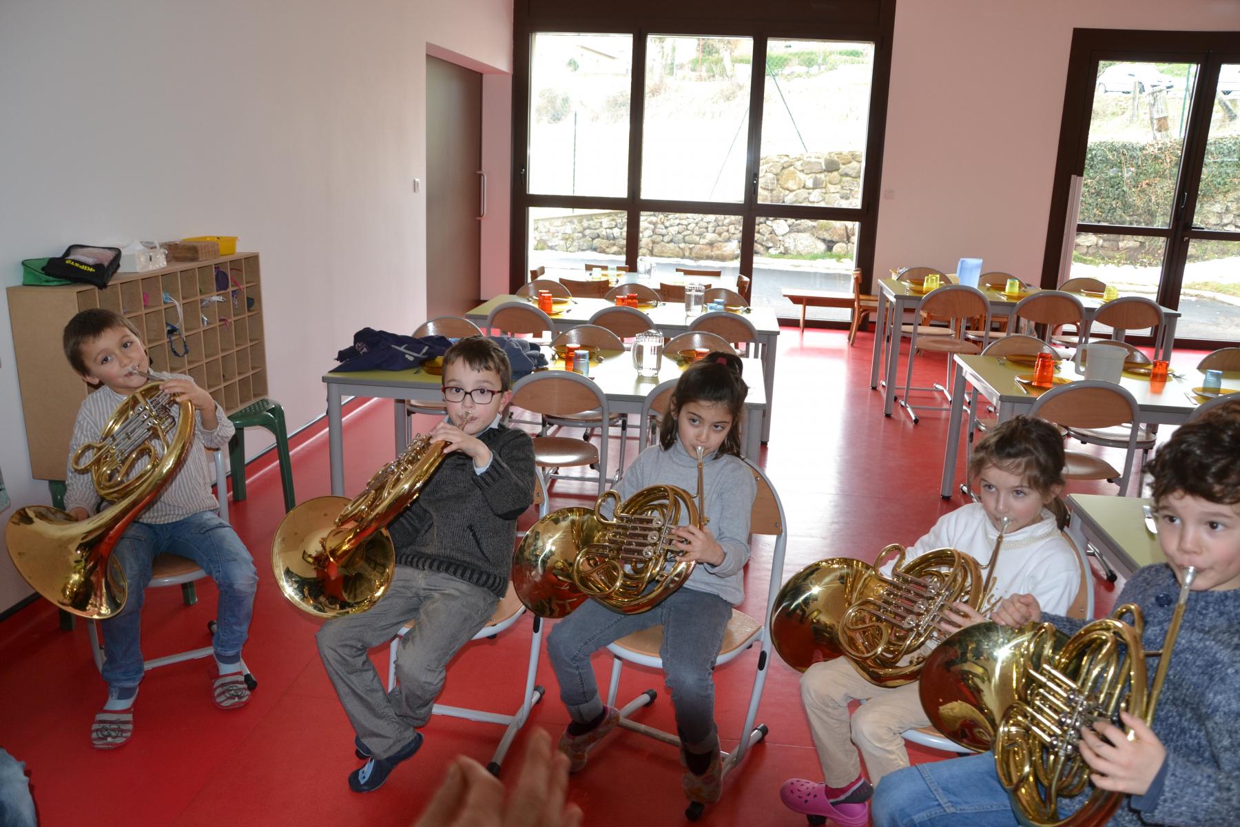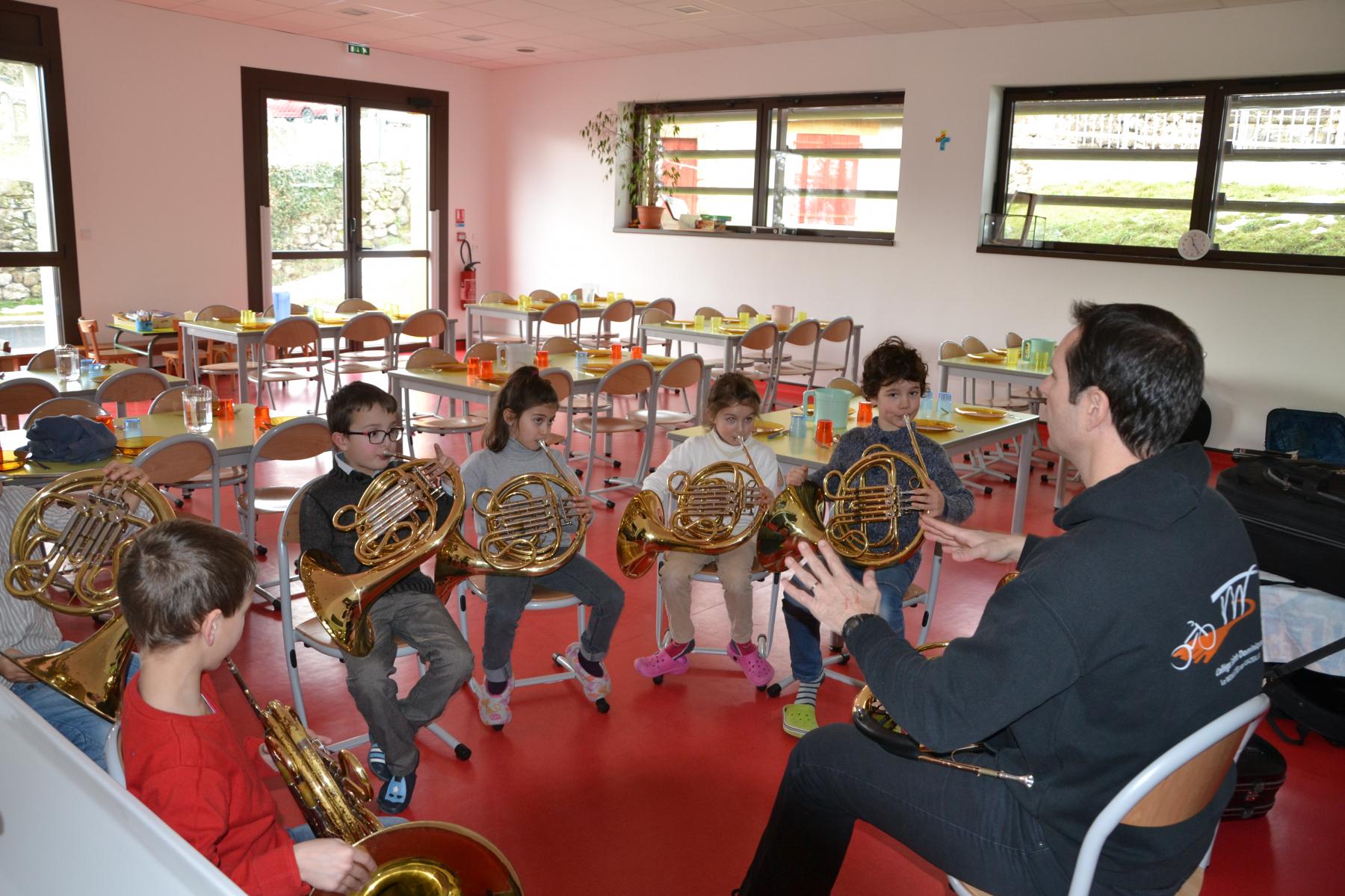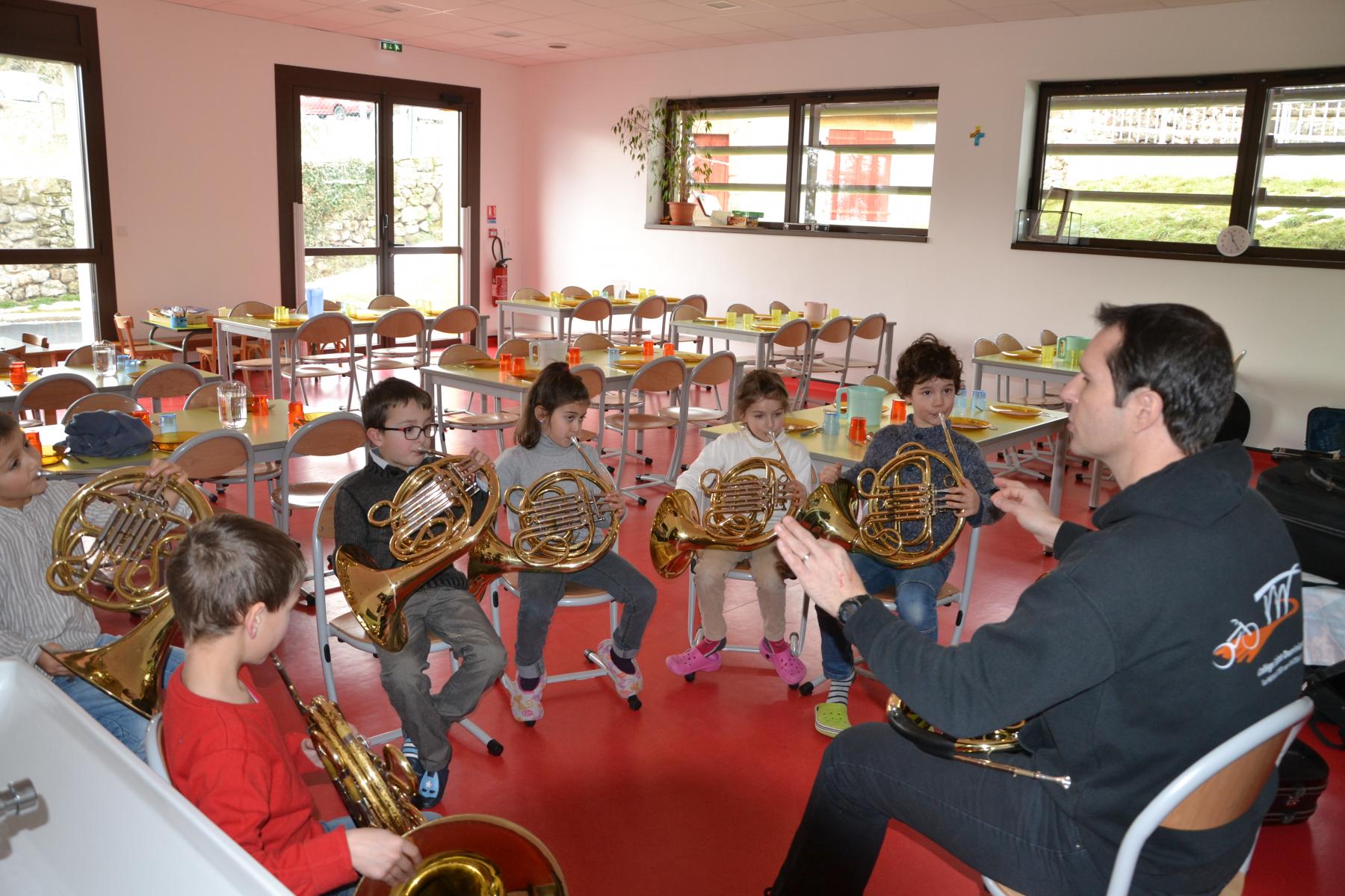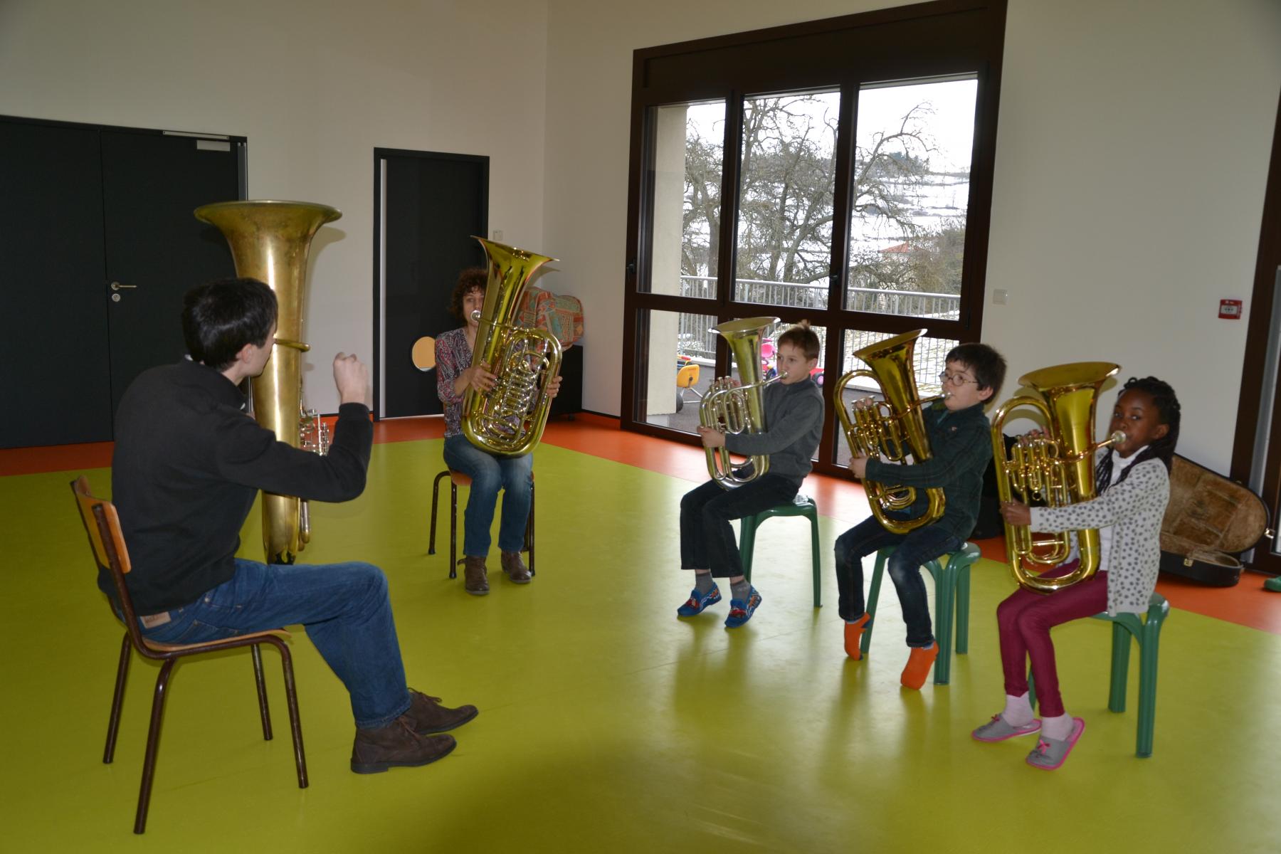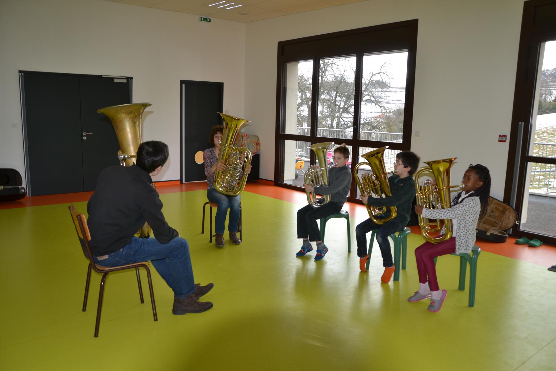 En partenariat avec l’atelier des Arts, dans le cadre du projet « classes orchestre », dès le mois de septembre, les élèves de CE1 –CE2 ont commencé à jouer des cuivres. Chaque enfant a choisi l’instrument qu’il préférait (trompette, cor, trombone ou tuba). Un spectacle aura lieu fin mai dans le cadre du festival des Impolissons. A compter d’une heure de cours par semaine, les élèves ont découvert leurs instruments, se sont familiarisés avec les notes . Ils ont appris différents morceaux. Et c’est avec fierté et un soupçon de trac qu’ils convieront parents, famille et amis à l’auditorium pour leur offrir un inoubliable concert. Pour l’instant, place à l’entraînement et aux répétitions. Tous les lundis, les élèves sont contents de retrouver leurs professeurs et ne cachent pas leur joie à l’idée d’apprendre de nouvelles mélodies.