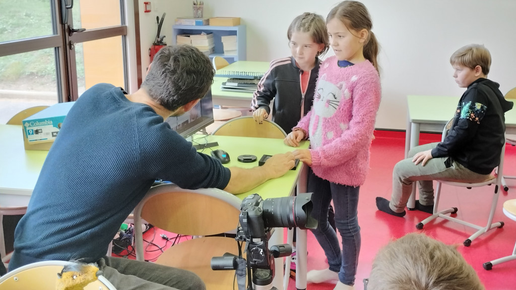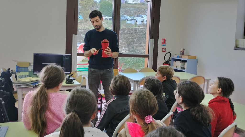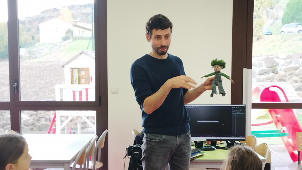 Il les a initié à cet art ludique mais exigeant.Il a pris le temps de leur présenter son métier et la manière dont il procèdait pour réaliser ses films, ses différentes créations .Et surtout comment il avait procédé pour réaliser le film de Céleste Arbol. Les élèves ont pu redécouvrir le personnage principal Céleste, la manière dont il bougeait et s'exprimait. Puis certains se sont essayés à donner vie , à faire bouger une lampe de bureau.
