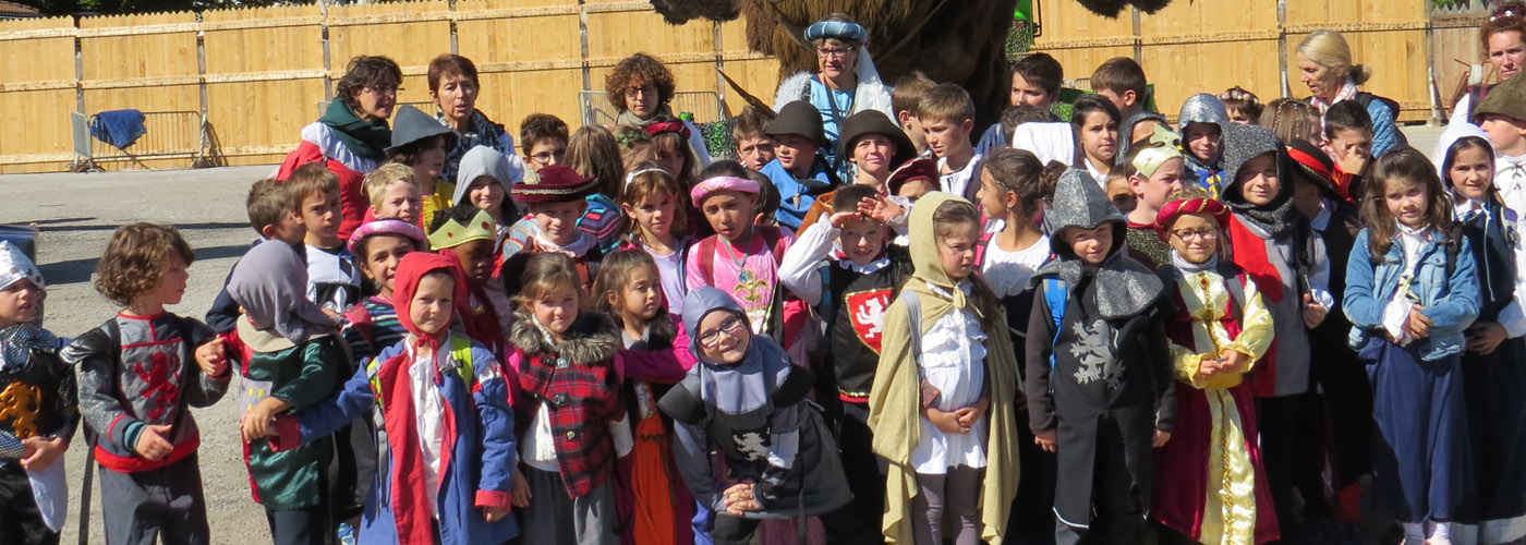 Puis chaque classe s’est répartie dans différents ateliers. Les CP et les CE ont essayé de se déplacer avec des échasses. D’autres ont essayé des casques et gants de chevaliers. Certains ont réalisé des objets en pâte à sel et se sont initiés à la calligraphie de l’époque. Quelle belle journée !
