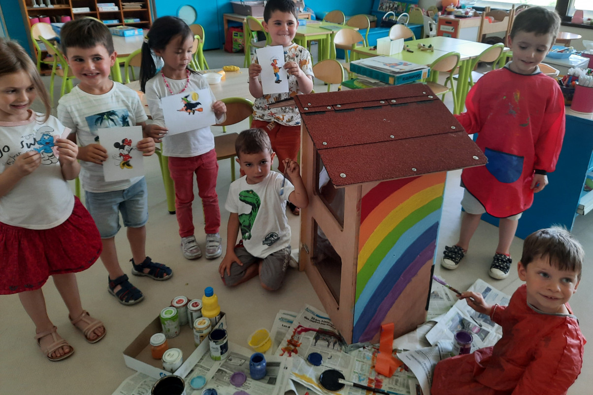 Les élèves de maternelles ont pris un réel plaisir à participer à ce projet. Avec leur maîtresse, ils ont cherché des idées et ont décidé de décorer la boîte à livres avec un livre, des personnages animés issus des contes et de la littérature de jeunesse . Ils n’ont bien sûr pas oublié de dessiner un joli château de Polignac. Ils seront fiers de retrouver leur boîte à livres dans le village.